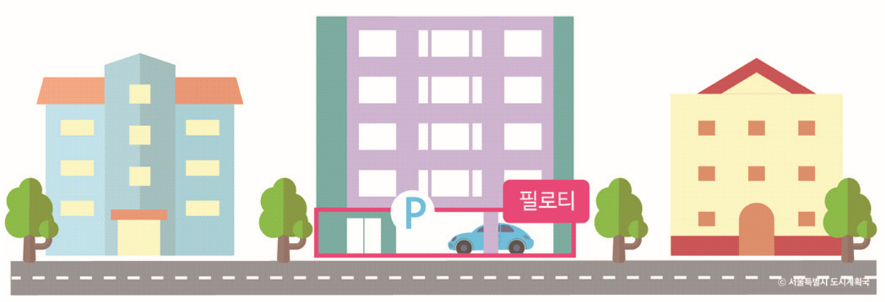 [정의]지면에 닿는 접지층에 있어서 기둥, 내력벽 등 하중을 지지하는 구조체 이외의 외벽, 설비 등을 설치하지 않고 개방시킨 구조를 말한다. [용어설명] 「건축법」에 의해 필로티나 그 밖에 이와 비슷한 구조(벽면적의 2분의 1 이상이 그 층의 바닥면에서 위층 바닥 아래면까지 공...