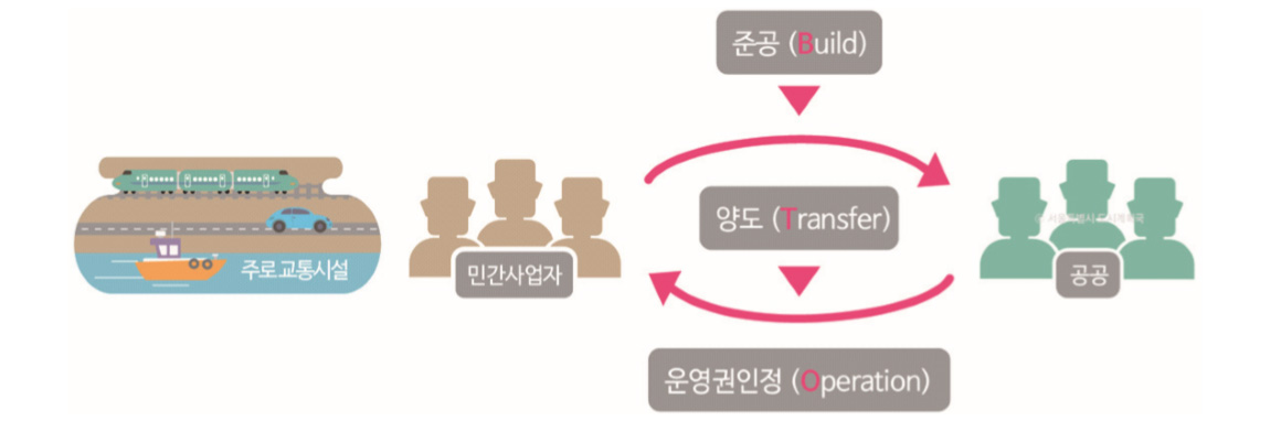 [정의] 민간이 건설하고 소유권은 정부나 지자체로 양도한 채 일정기간동안 민간이 직접 운영하여 사용자 이용료로 수익을 추구하는 민간투자사업 방식을 말한다. [용어설명]BTO(Build-Transfer-Operate)는 「사회기반시설에 대한 민간투자법」에 의한 민간투자 사업 방식의 하나이다. 사회기반시설의 준공(Bu...