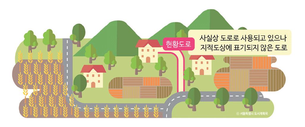 [정의]지적도 상에 도로로 표기되어 있지 않지만 주민이 오랫동안 통행로로 이용하고 있는 사실상의 도로를 말한다. [용어설명]「건축법」에서는 건축허가 또는 신고 시에 특별시장·광역시장·도지사·특별자치도지사 또는 시장·군수·구청장이 현황도로를 「건축법」상 도로로 지정·공고할 수 있는...