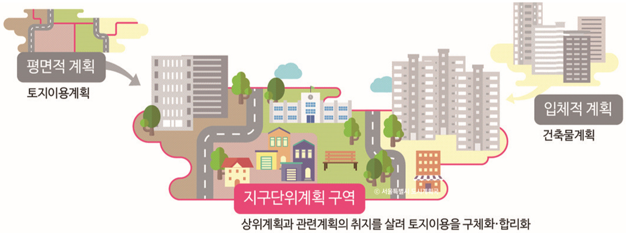 [정의]도시계획을 수립하는 지역 가운데 일부지역의 토지이용을 보다 합리화하고 그 기능을 증진시키며 미관의 개선 및 양호한 환경의 확보 등 당해 지역을 체계적·계획적으로 관리하기 위하여 수립하는 도시관리계획을 말한다. [용어설명]지구단위계획은 종전의 「도시계획법」에 의한 상세계획...