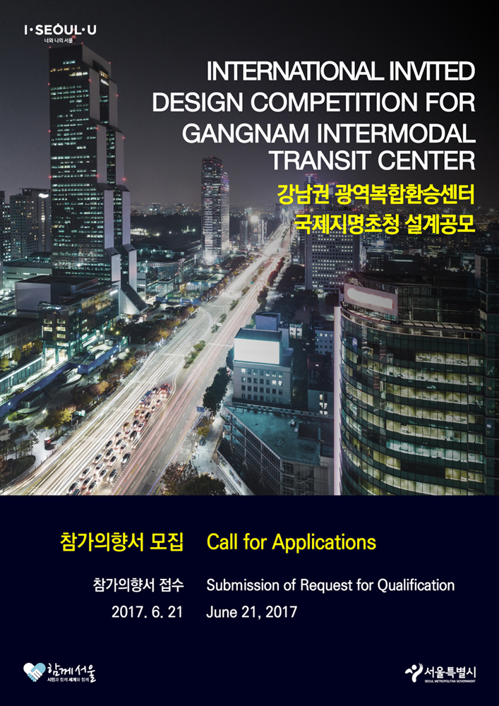 서울특별시는 영동대로 일대에 사람 중심의 광역도시권 대중교통 허브를 조성하는 기본설계안을 마련하기 위해 「강남권 광역복합환승센터 국제지명초청 설계공모」를 개최할 예정입니다. 본 설계공모는 1단계 국제지명초청 설계공모로 진행될 예정이며, 지명초청팀 선정을 위해 참가의향서를 받고자 합니다...