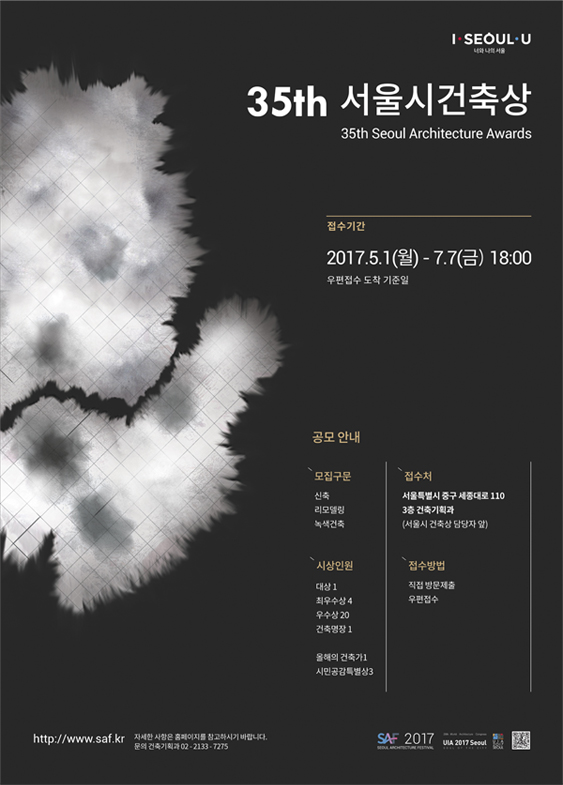 제35회 서울시건축상 공고 제35회 「서울특별시 건축상」 작품모집 공고서울특별시에서는 건축의 공공적 가치를 구현하여 시민의 삶의 질을 향상시킨 우수한 건축물을 장려하고자 서울의 건축문화와 건축기술 발전에 기여한 건축가 및 시민에게 「서울특별시 건축상」을 시상하고자 합니다.  ...