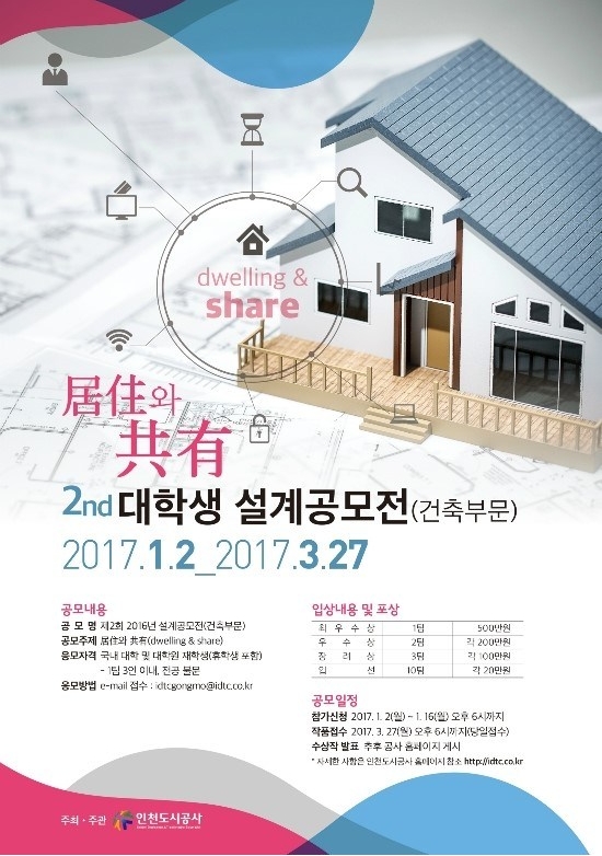 대학생 설계공모전(건축부문) 개최인천도시공사는 새로운 주거유형의 모색을 위한 비전을 공유하고 대학(원)생들의 참신한 아이디어를 발굴하고자<제2회 2016년 설계공모전(건축부문)>을 개최합니다.1. 공모개요가. 공모주제 :「居住와 共有(dwelling & share)」나. 응모자격 : 국내 대학 및 대학원 ...