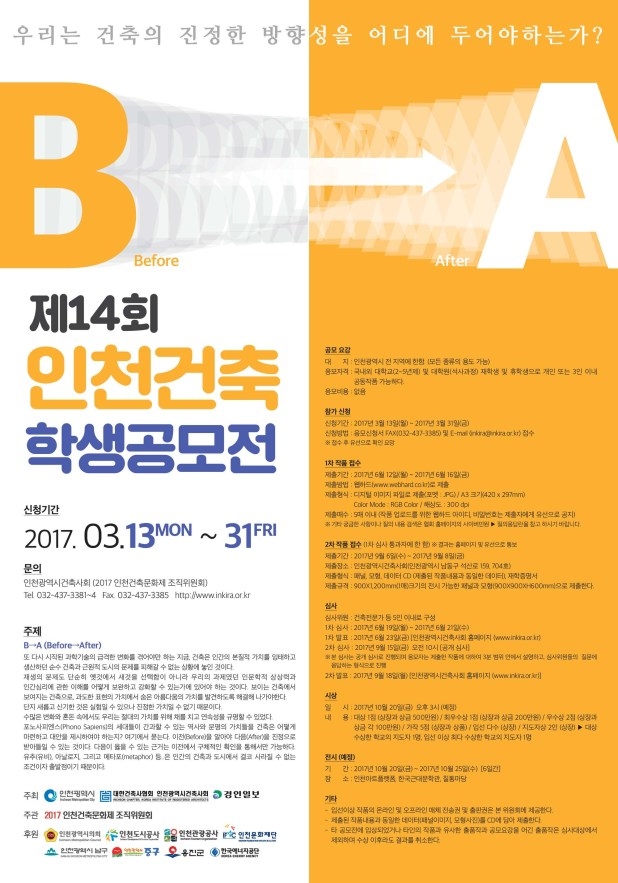 2017 공모요강제출양식_ A3 규격의 보고서 양식의 작품 보고서 l 표지, 목차, 개요, 도면 등 20장 내외제출내역_ 접수번호를 기입한 출품신청서_ 작품보고서 원본 1부_ 작품보고서 각 페이지 번호를 파일명으로 하는 JPEG 파일을 담은 CD제출방법_ 등기우편 l 방문 접수 불가제출주소_ ...