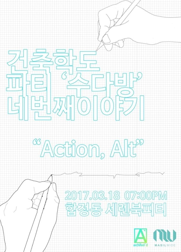 [수다방 제4회, Architecture, Action, Alt]아키필드가 건축학도 네트워크파티 수다방, 그 네번째 이야기를 초대한다.이번 수다방은 신학기를 맞이하여 다양한 지역, 학교의 건축학도간 교류의 장으로 마련될 예정이다.아울러 건축인 자율 세션인 ‘수다방톡’ 에서는 건축학도와 현업인의 경계없이 진행되는 세션으로, ...