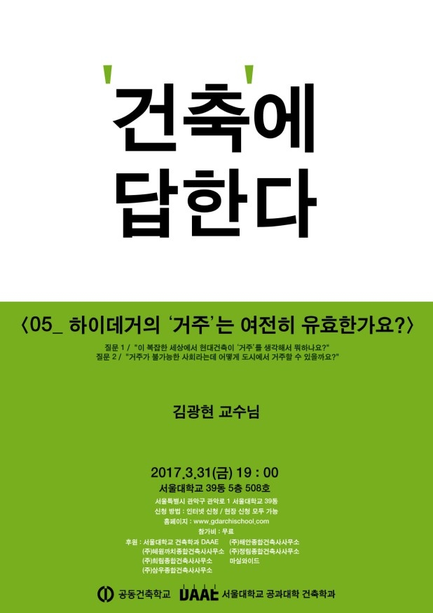 김광현 공동건축학교이 복작합 세상에서 현대건축기 ‘거주’를 생각해서 뭐하나요?/ 거주가 불가능한 사회라는데 어떻게 도시에서 거주할 수 있을까요? 라는 질문과 함께 2017년 3월 31일 하이데거의 ‘거주’는 여전히 유효한가에 대한 주제로 강연이 열린다. 개요날짜 : 2017.03.31(금) 19:00장소 : 서...