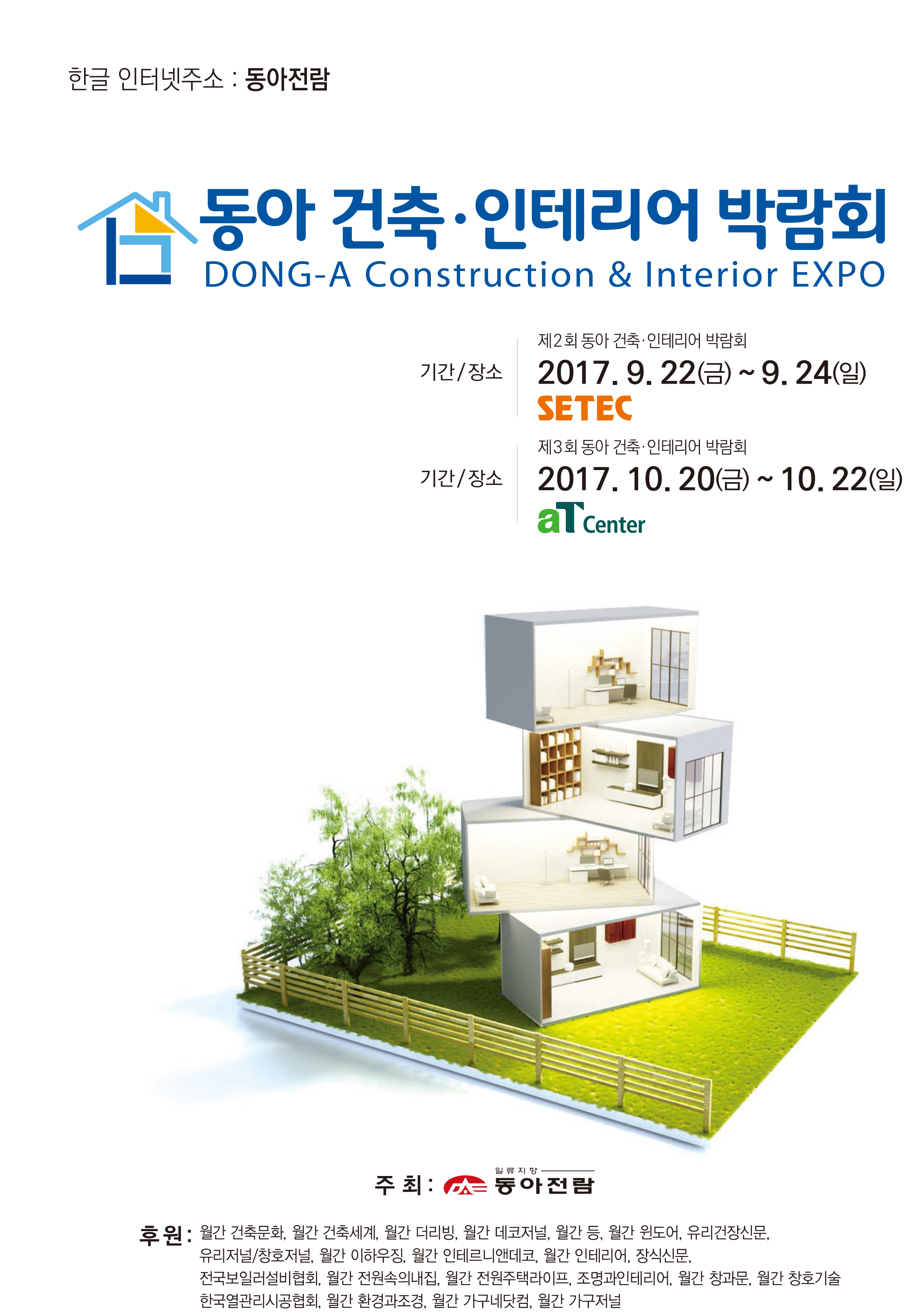 「박람회 전문기업 동아전람」은 바르고 유익한 건축정보와 가구 · 홈인테리어 관련 정보를 제공하고 관련산업의 활성화를 위해「동아 건축·인테리어 박람회」를 9월 22일부터 9월 24일까지 SETEC에서 10월 20일부터 10월 22일까지 aT Center 에서 개최합니다.「동아전람 ...