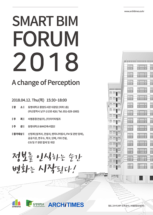 SMART BIM FORUM 2018-A Change of Perception지난 4월 12일(목) 동명대학교에서 씨엠종합건설㈜, ㈜아키타임즈에서 주최하는 Smart BIM Forum 2018이 진행되었다.     BIM 활용성, BIM 필요성을 강조한 세미나로 3부로 나뉘어 진행이 되었으며, 각 주제는 아래와 같다.1부 / 인식의 변화...