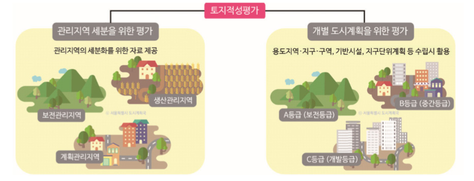 [정의]토지의 환경생태적·물리적·공간적 특성을 종합적으로 고려하여 개별토지가 갖는 환경적· 사회적 가치를 과학적으로 평가함으로써 도시·군기본계획을 수립·변경하거나 도시·군관리계획을 입안하는 경우 정량적·체계적인 판단 근거를 제공하기 위하여 실시하는 기초조사이다. [용어설명]토지적성평가는 도시관...