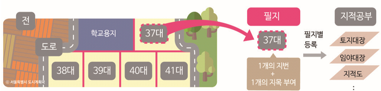 [정의]구분되는 경계를 가지는 토지의 등록단위로서 하나의 지번을 가지고 지적공부에 등록되는 토지의 기본 단위를 말한다. [용어설명]「공간정보의 구축 및 관리 등에 관한 법률」에서는 필지를 ‘구획되는 토지의 등록단위’로 정의하고 있으며 1개의 필지에 1개의 지번과 지목이 부여된...