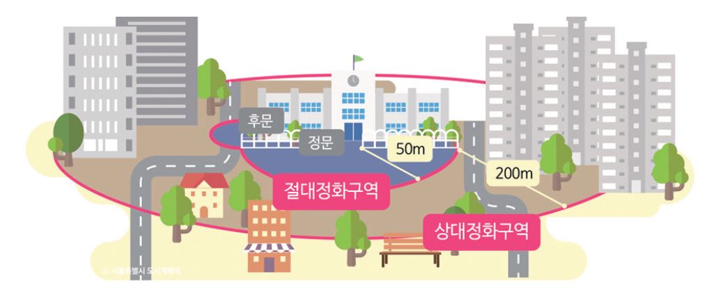 [정의]학교의 보건·위생 및 학습 환경을 보호하기 위하여 「학교보건법」에 의해 지정된 구역을 말한다. [용어설명]학교환경위생 정화구역은 학교보건법에 따라 교육감이 지정하며, 이는 절대정화구역과 상대정화구역으로 구분하여 설정한다. 1. 절대정화구역 : 학교출입문(학교설립예정지...