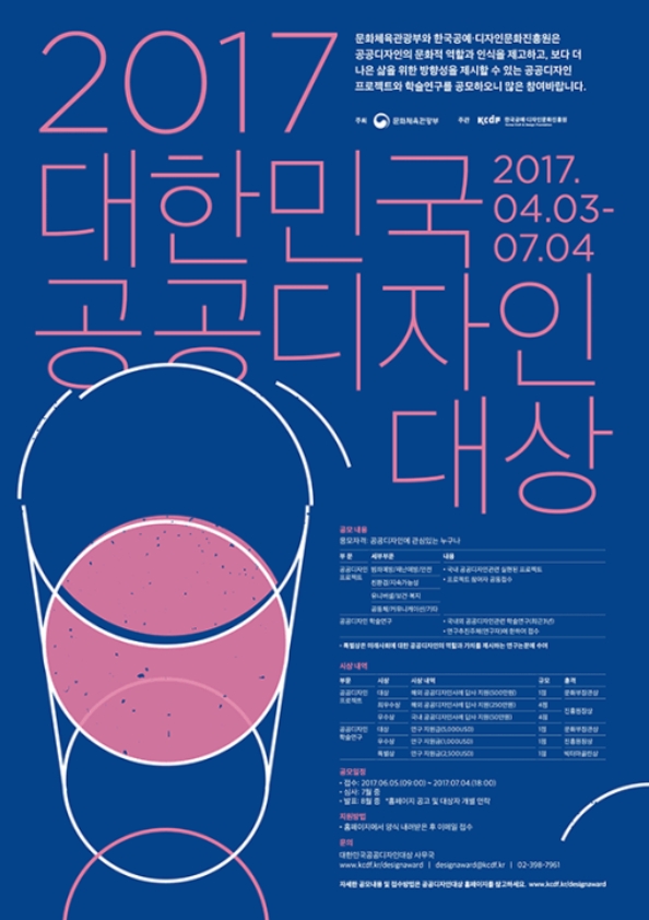 2017 대한민국공공디자인대상 문화체육관광부와 한국공예-디자인문화진흥원은 공공디자인의 문화적 역할과 인식을 제고하고, 보다 더 나은 삶을 위한 방향성을 제시하고자 공모를 진행합니다.공공디자인의 모범사례를 발굴하여 공공디자인에 대한 바람직한 기준을 제시하고, 연구개발(R&D)강화를 통해...